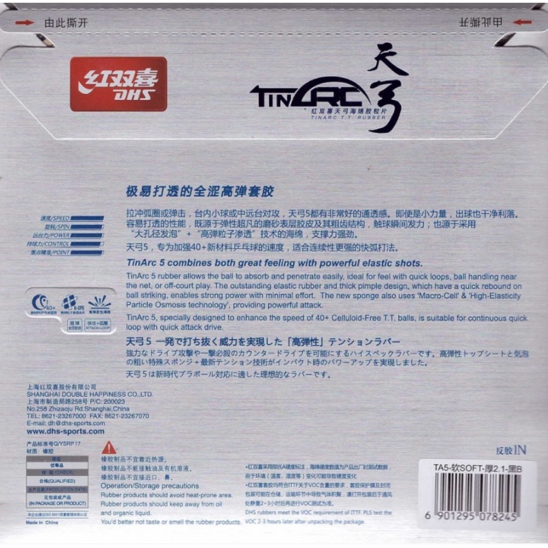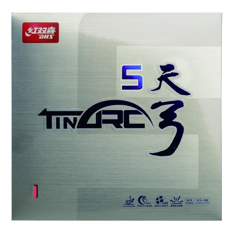 A nova esponja Soft com tecnologia "Macro Cell & Hight-Elasticity Particle Osmosis" fornece grande capacidade de ataque a esta borracha. A DHS TinArc5 Soft foi especialmente concebida para tirar partidos das bolas de plástico 40+ e é adequada para uma estratégia ofensiva contínua.